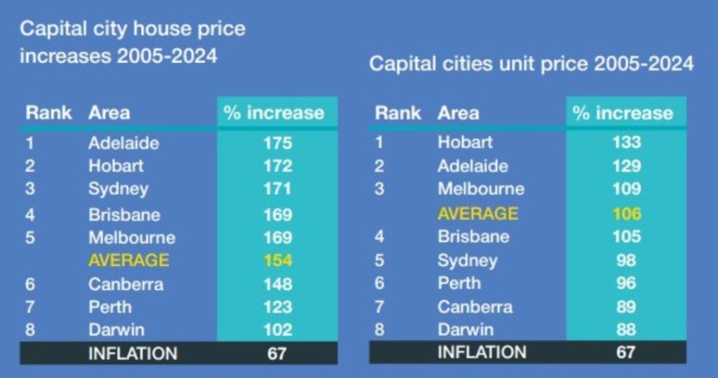 Over the 20 years from 2005 to 2024, capital city house values rose by an average of 154%, while unit values increased 106%, according to the API’s Valuation Insights Report